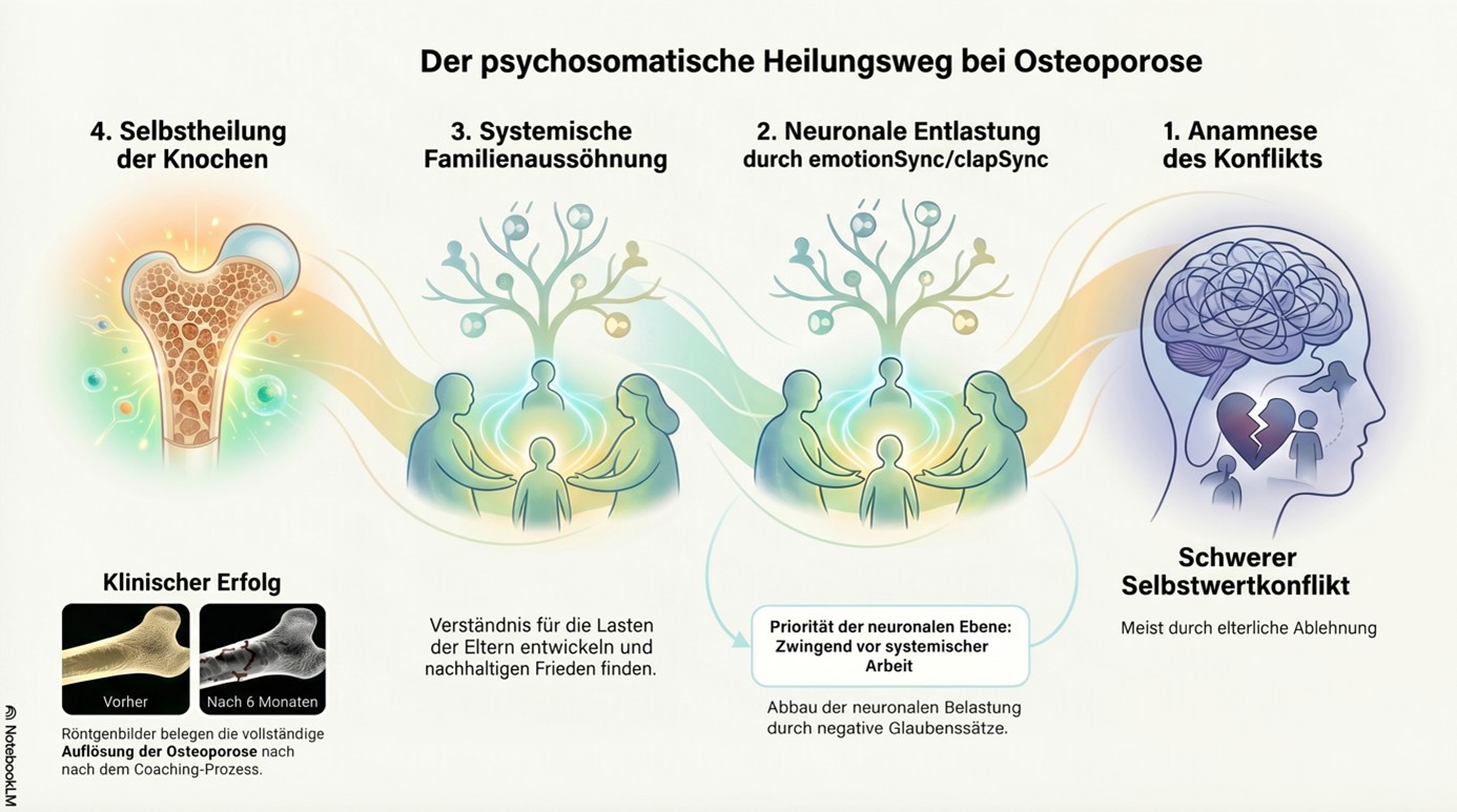Dieser Bericht beschreibt die erfolgreiche psychosomatische Behandlung eines Patienten, der unter schwerer Osteoporose litt. Der Autor führt die körperliche Knochenschwäche auf einen tiefgreifenden Selbstwertkonflikt zurück, der durch die Ablehnung des Vaters in der Kindheit entstanden war. Durch den gezielten Einsatz von Neurocoaching und speziellen Techniken wie emotionSync wurde zunächst die neuronale Belastung reduziert, bevor eine systemische Versöhnung stattfinden konnte. Erst nach dieser emotionalen Entlastung verschwanden die negativen Glaubenssätze, was laut dem Bericht zur vollständigen Remineralisierung der Knochenführte. Der Fall unterstreicht die These, dass die Heilung des Körpers untrennbar mit der Auflösung psychischer Blockaden und der richtigen therapeutischen Reihenfolge verbunden ist.